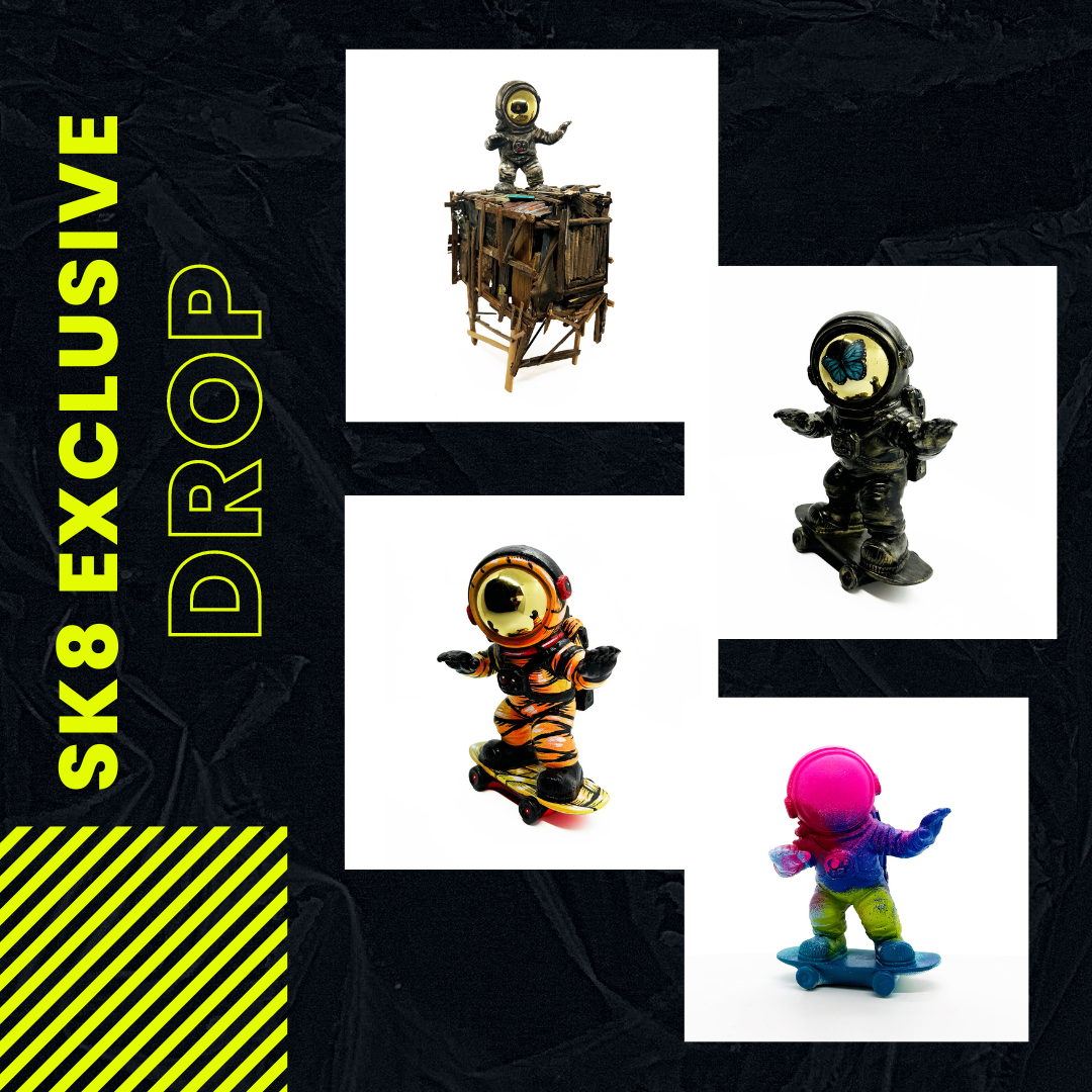 Enter our Launch Raffle for a chance to win limited edition Sk8 sculptures by renowned artists Jeff Gillette, Louis McNaught, Otto Schade, and Cope 2. Each sculpture is a unique representation of skate