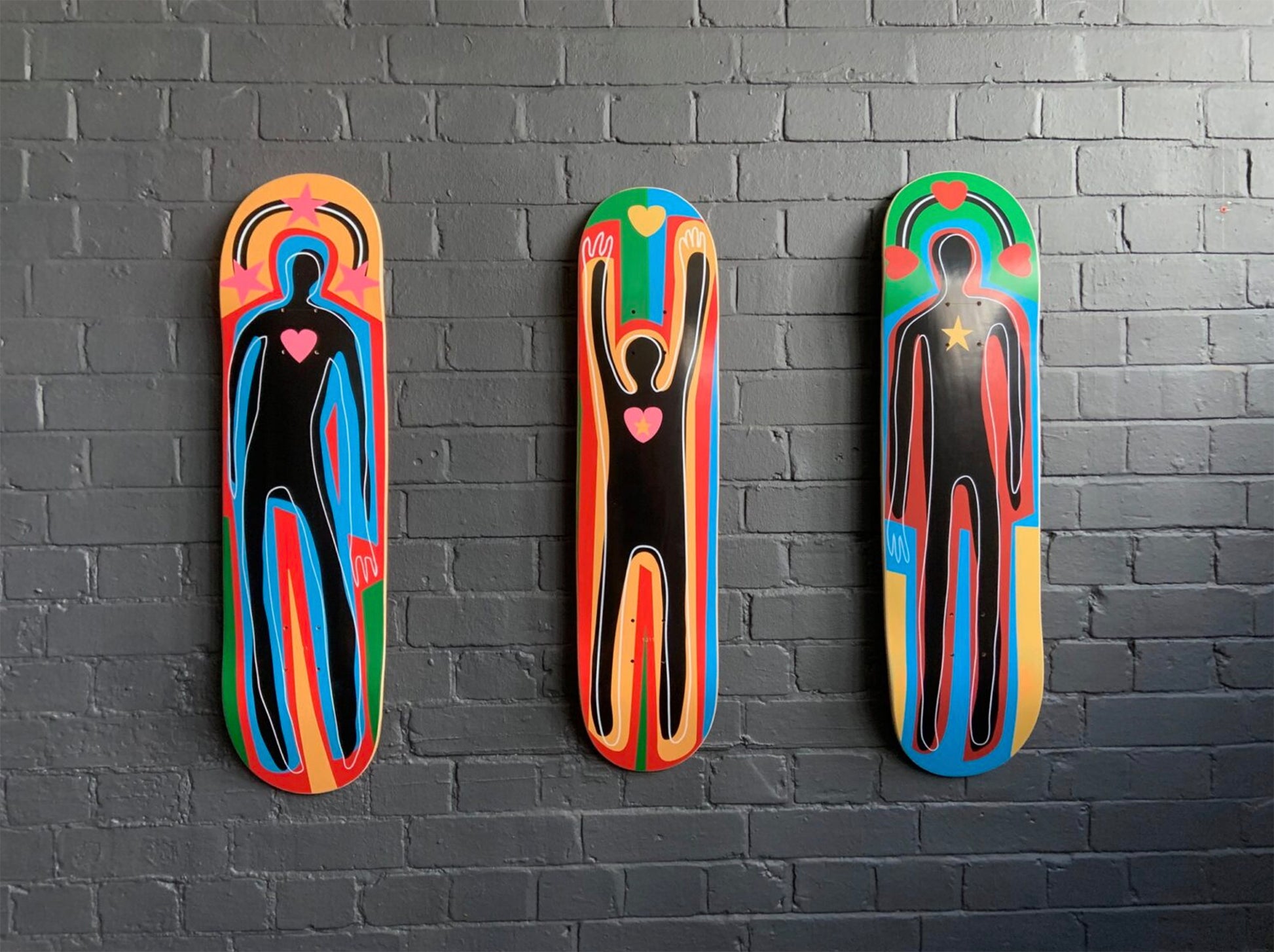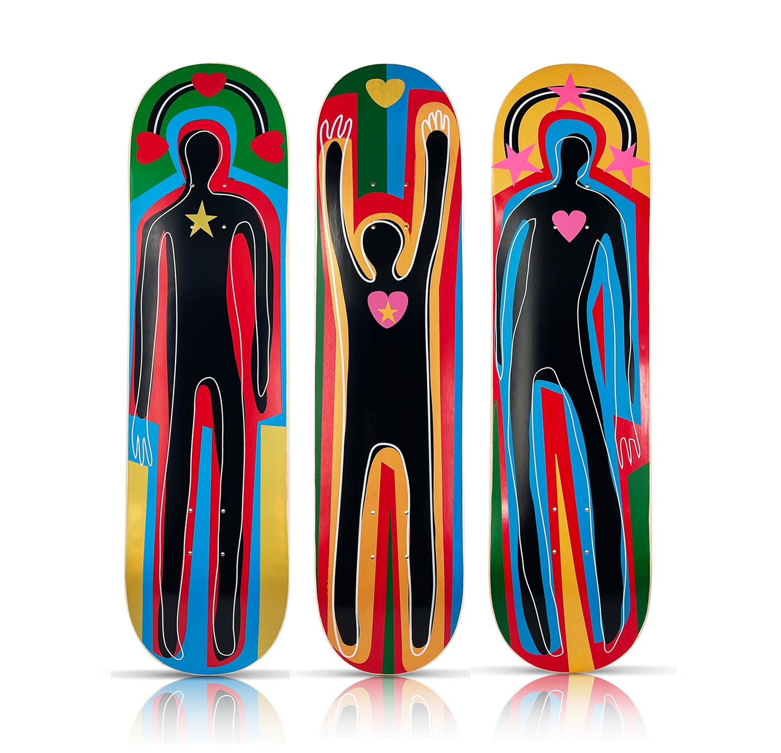 Adam Neate, an old friend of Clown Skateboards and self-taught artist, is next up to bat in their Guest Art Project series. Neate’s boards are a reflection of the ‘family’ that is the skateboarding community. By celebrating gender fluidity in today’s society, the triptych proclaims that love and mutual support are far more important than gender.