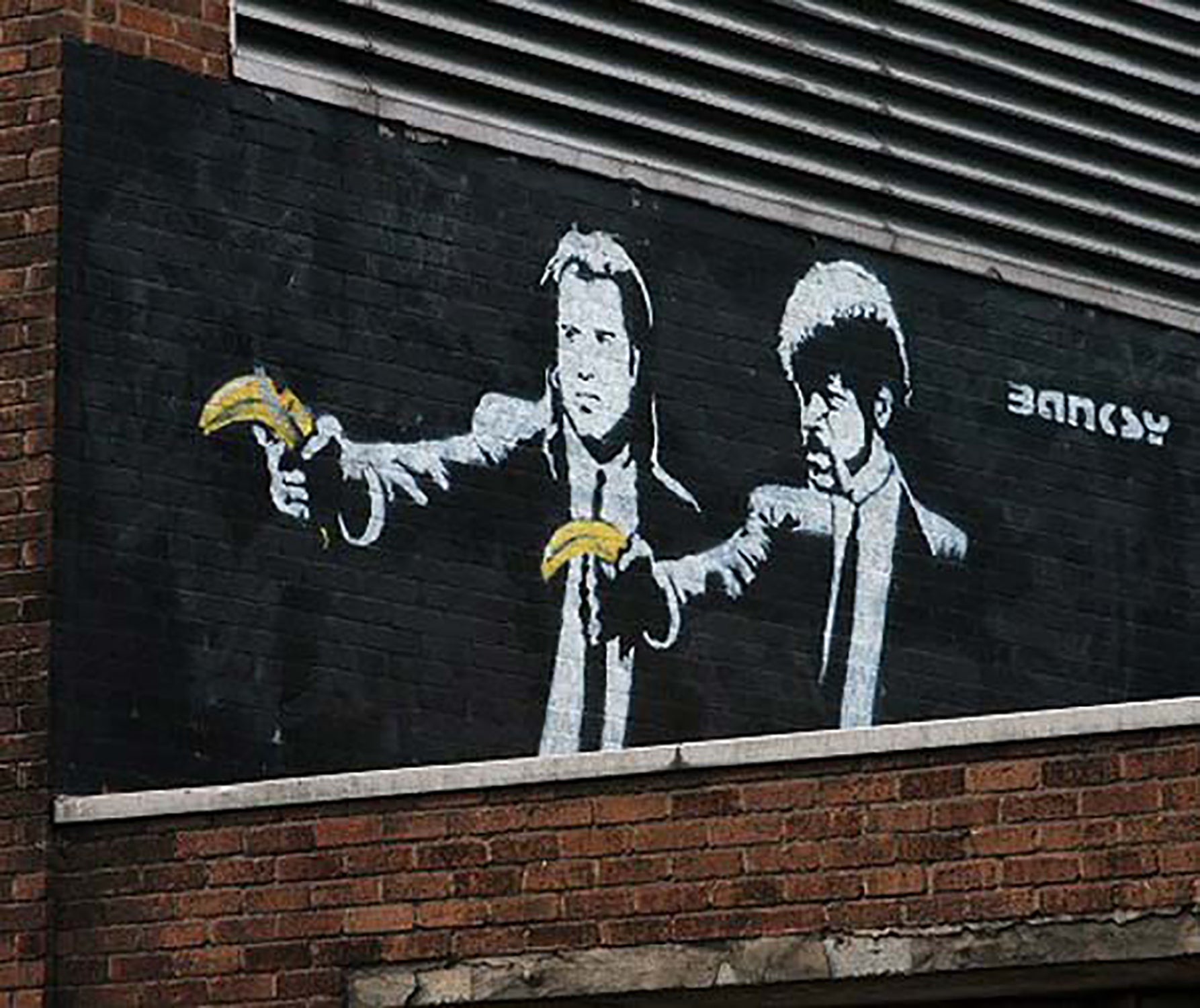 It was visible until 2007, when Transport for London painted over the wall, on the grounds that the work lent an atmosphere of social decay and neglect in the capital, despite the well-known image drawing art fans and tourists to the area. When the mural was covered, a local artist sprayed-painted the words “Come Back” in its place, addressed to Banksy. Banksy then, of course, re-tagged his original Pulp Fiction in exactly the same place, but this time the characters were holding real pistols and wearing banana costumes instead.