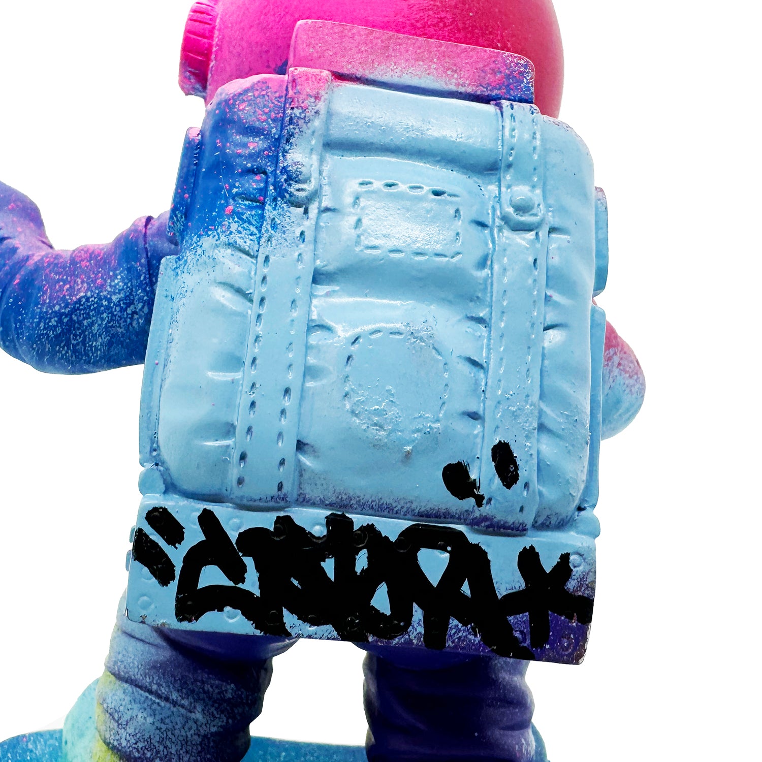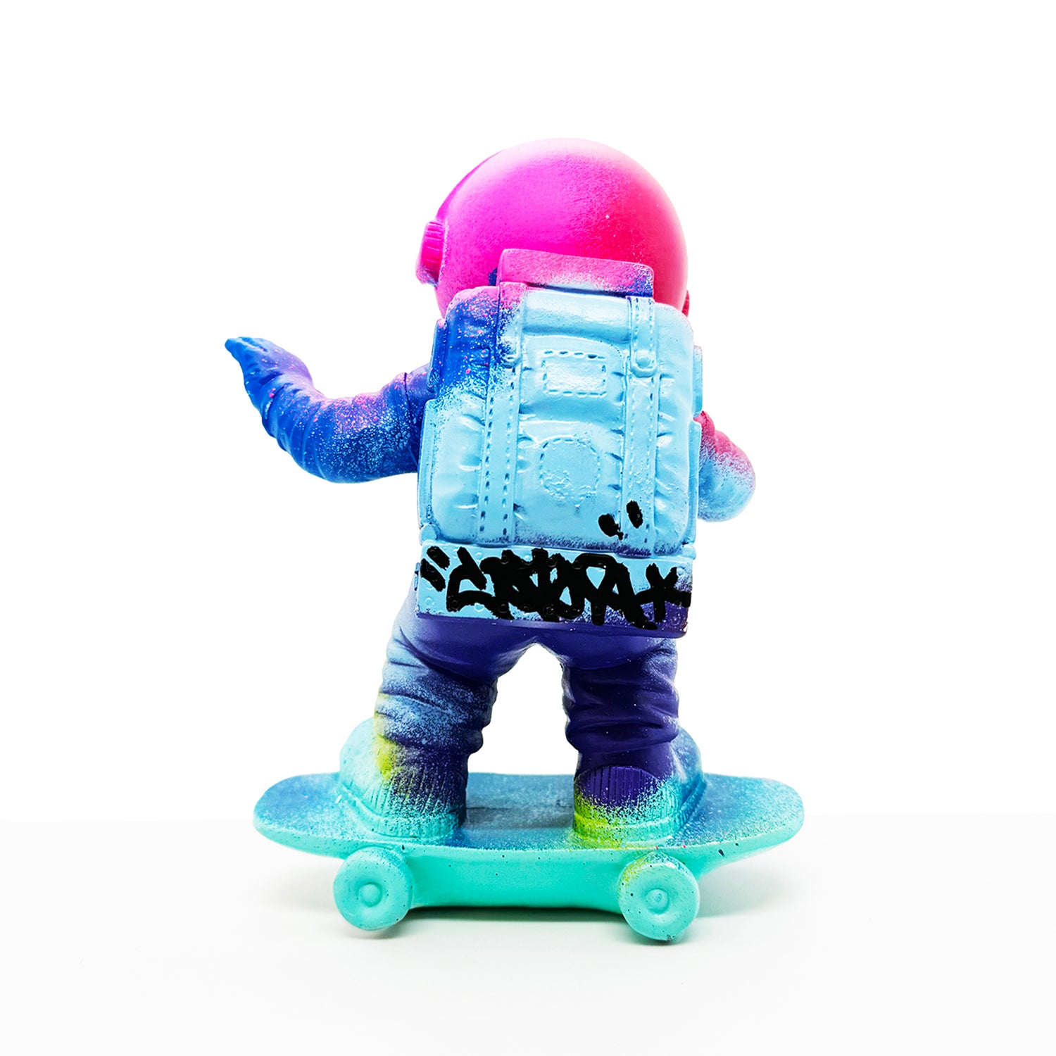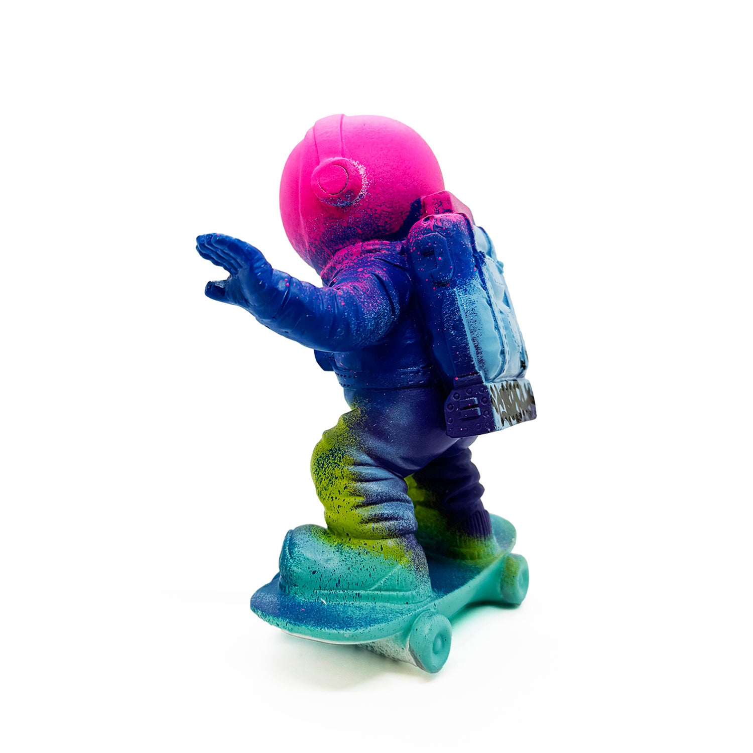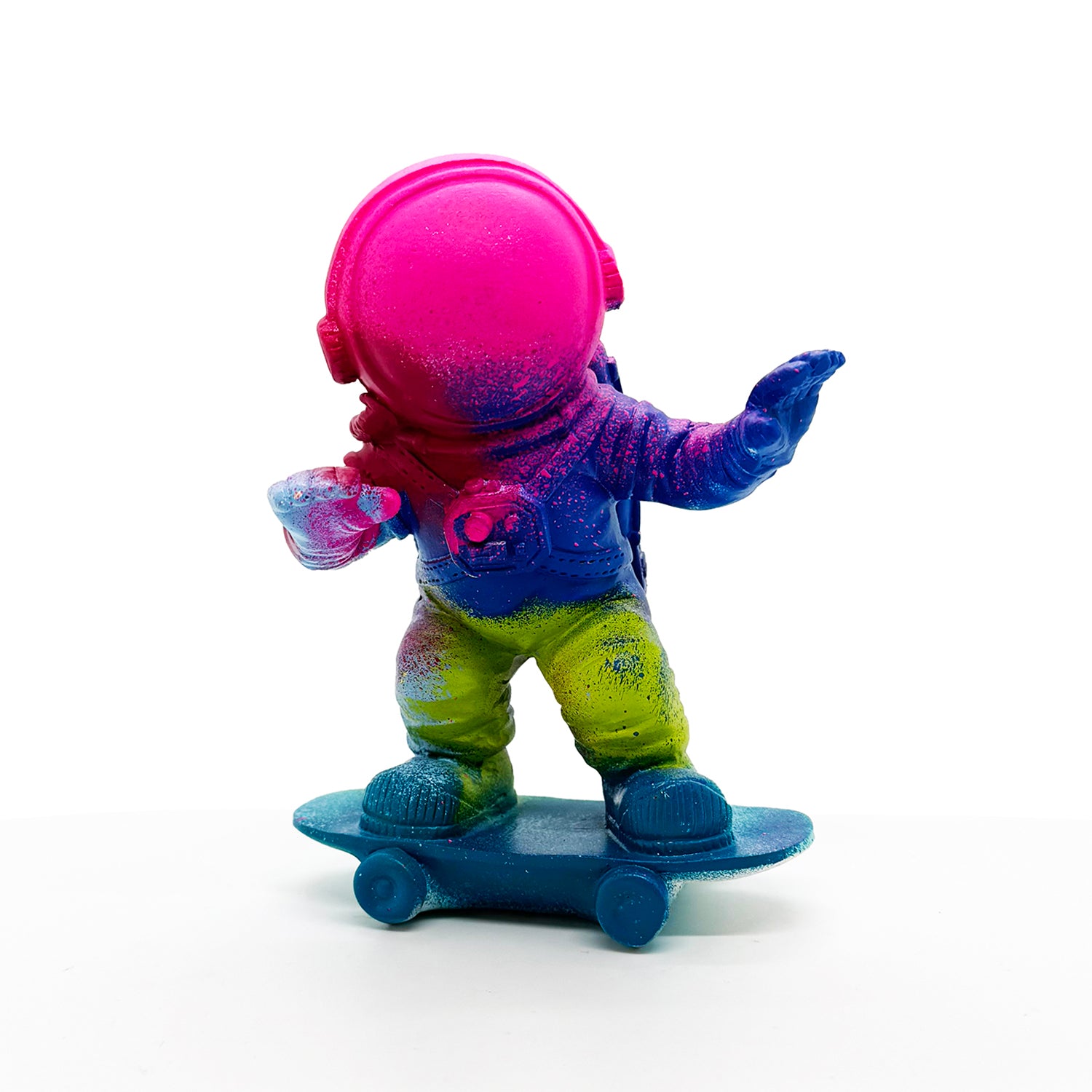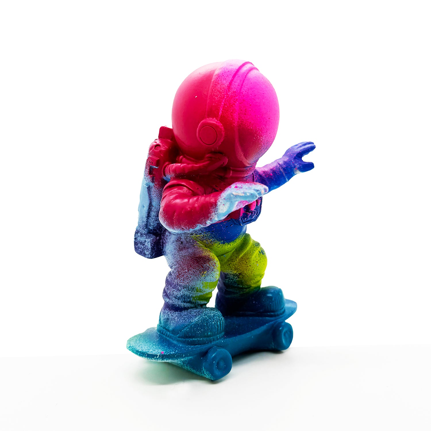 Hand-painted resin skateboarding astronaut figure in colorful array of spray paints.