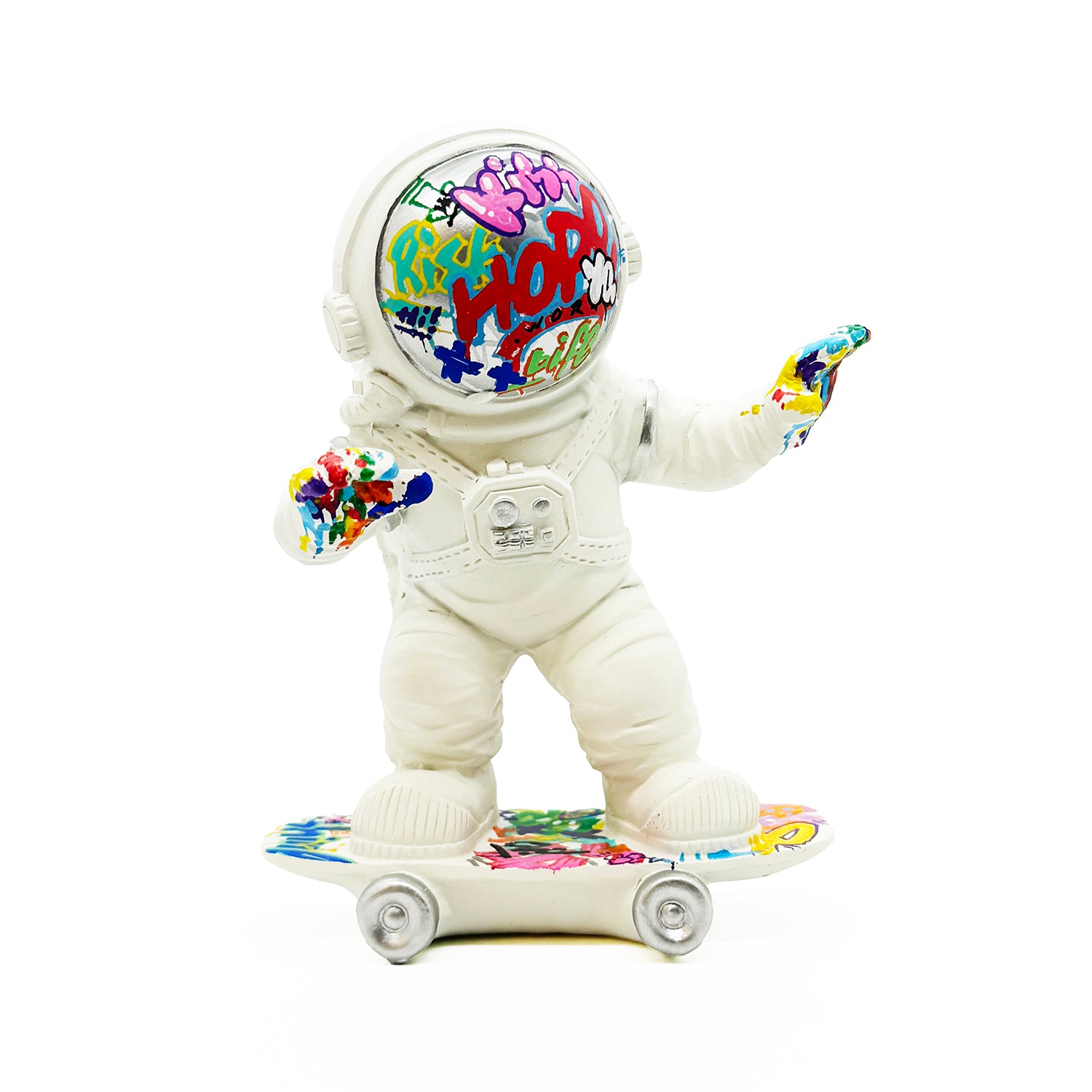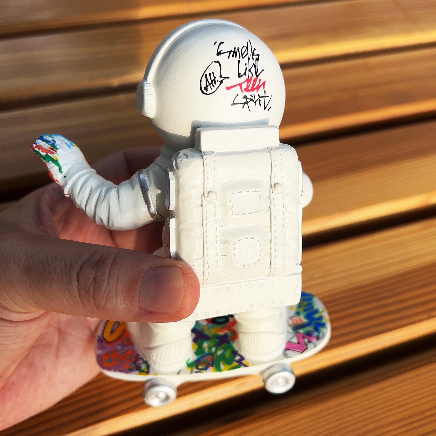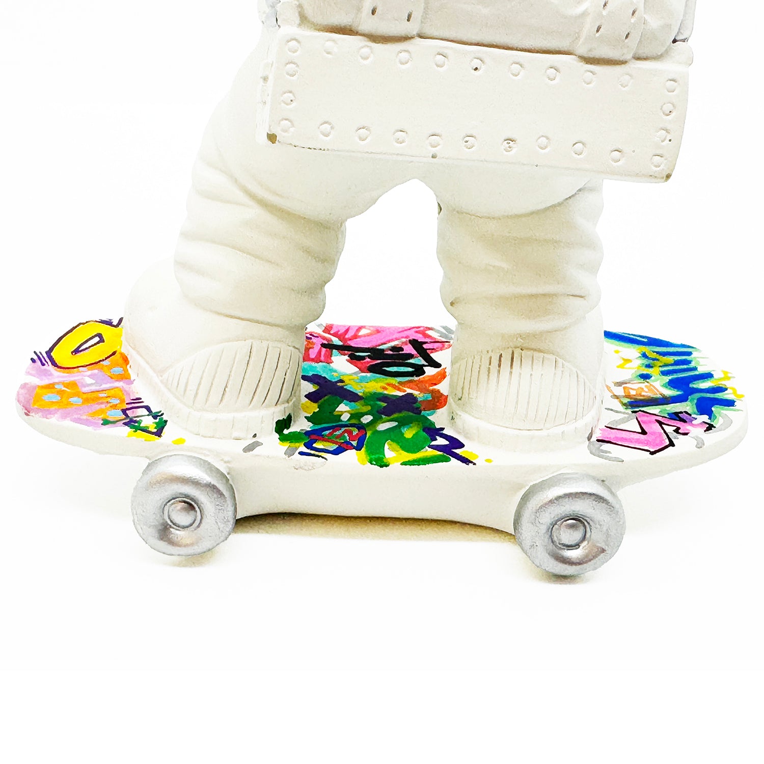 Hand-painted resin skateboarding astronaut figure in the artist's signature colorful, graffiti-tag style.