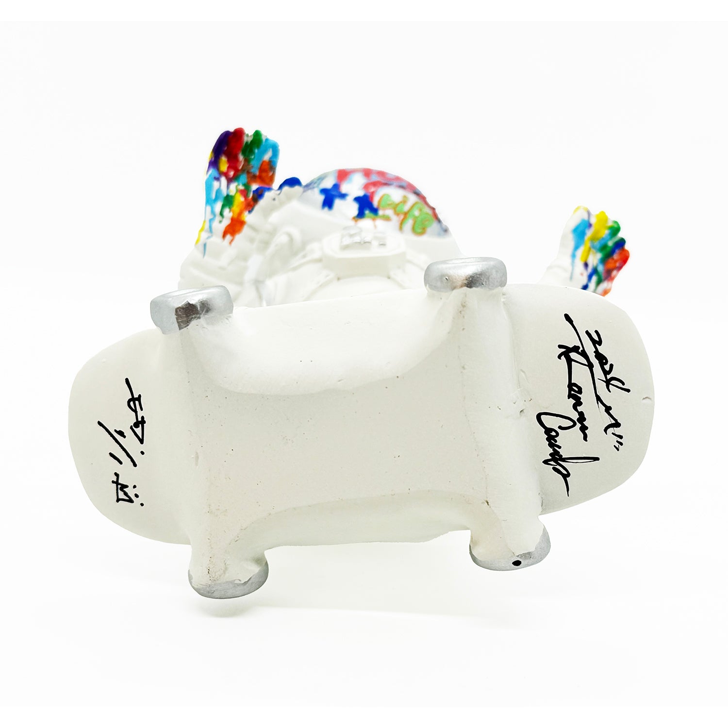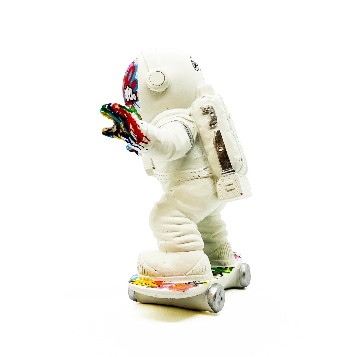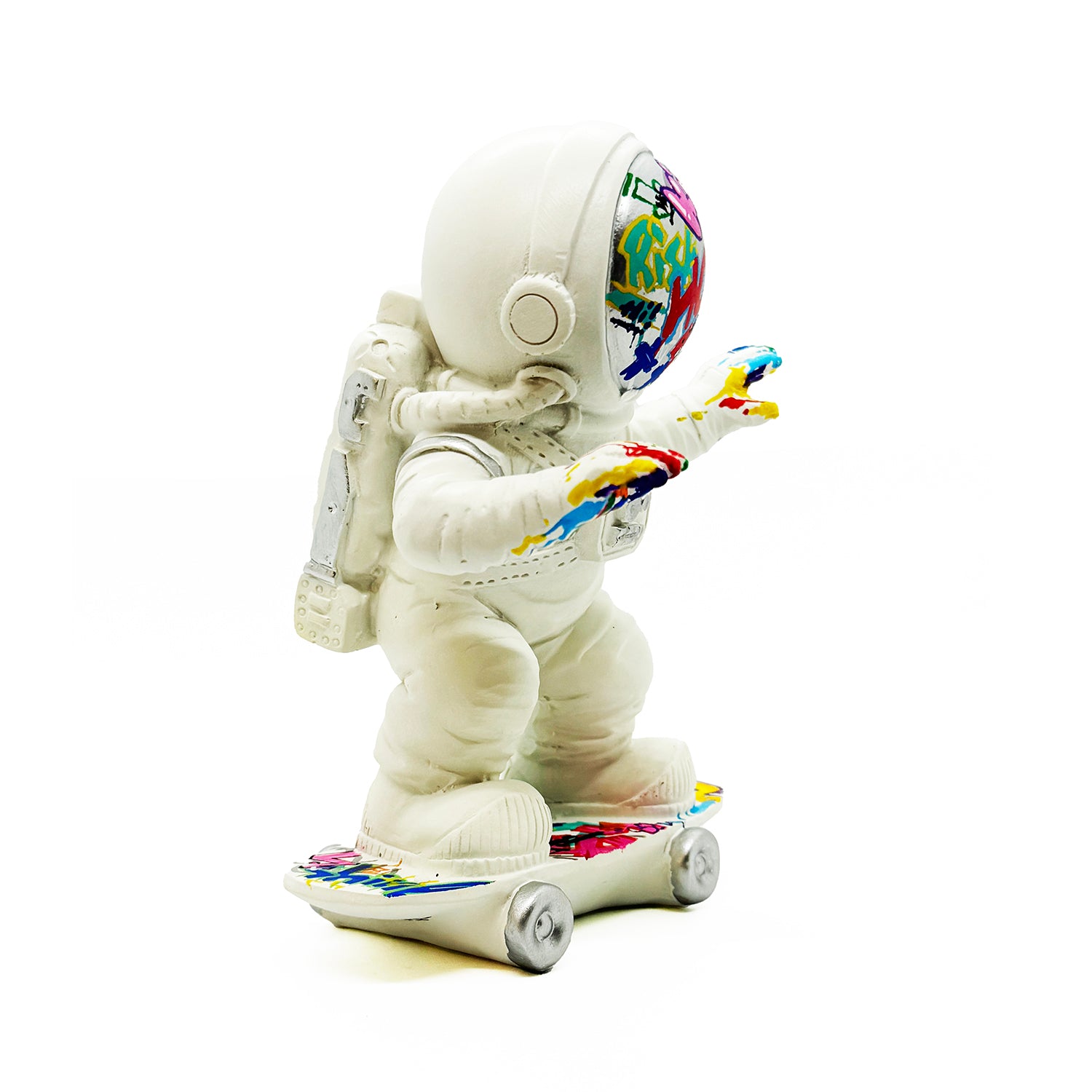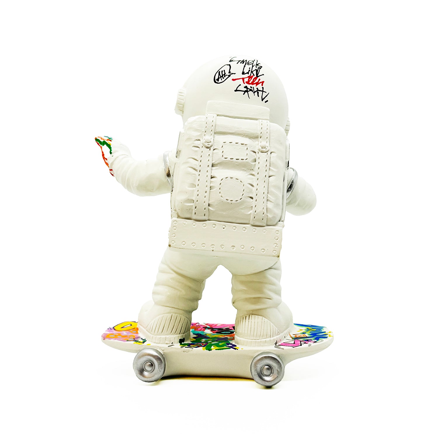 Hand-painted resin skateboarding astronaut figure in the artist's signature colorful, graffiti-tag style.