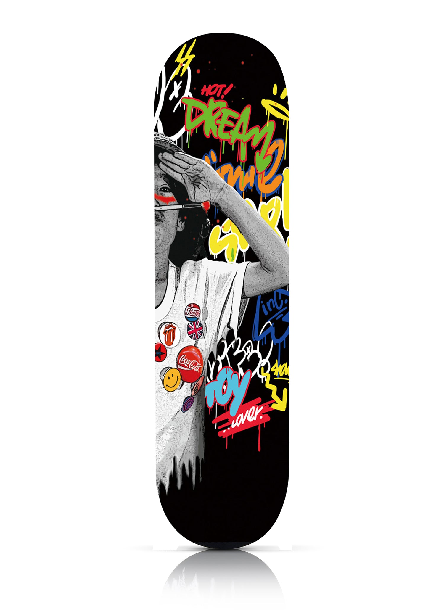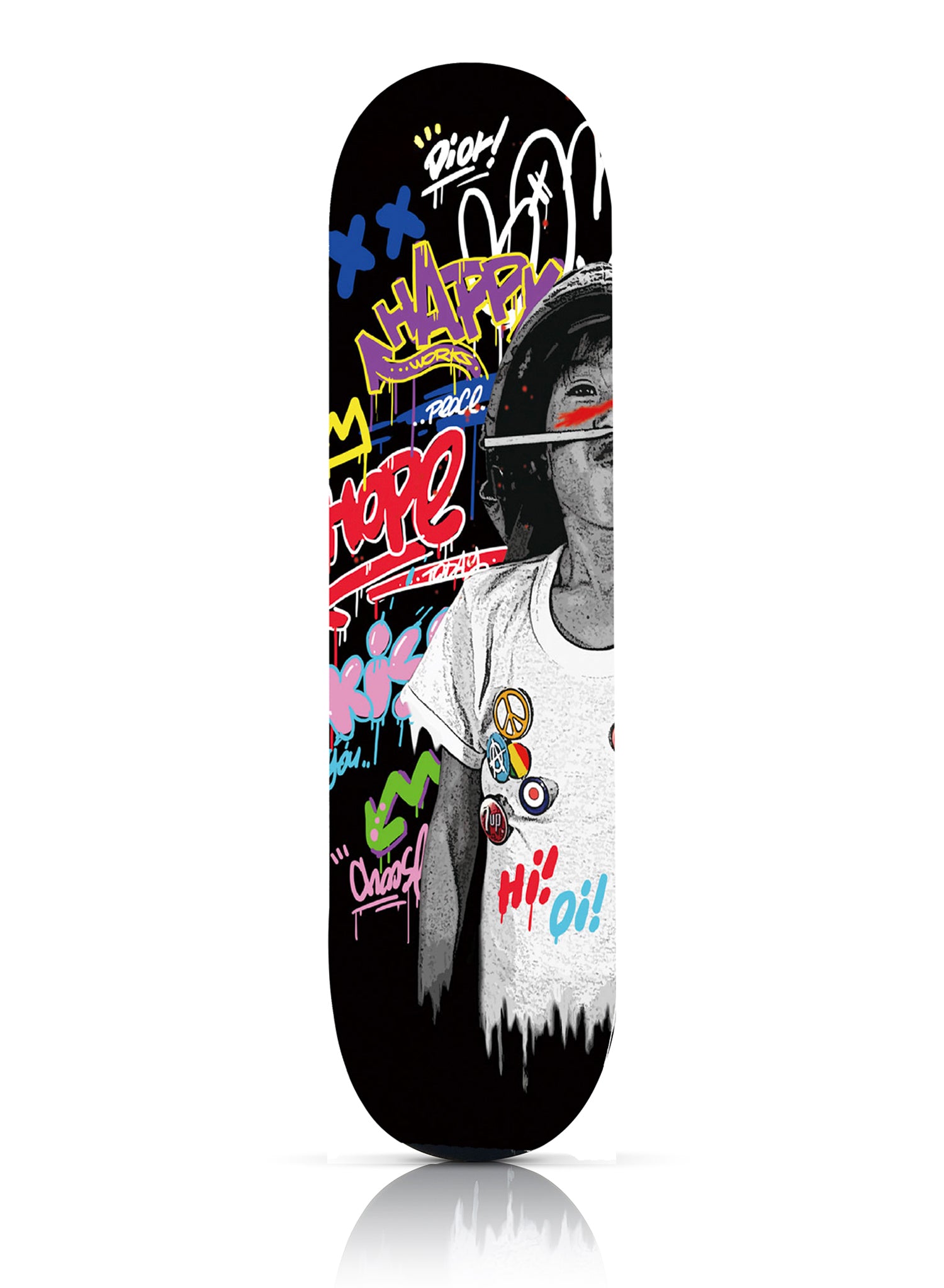 Hand-numbered custom deck top label with artist and gallery logos.